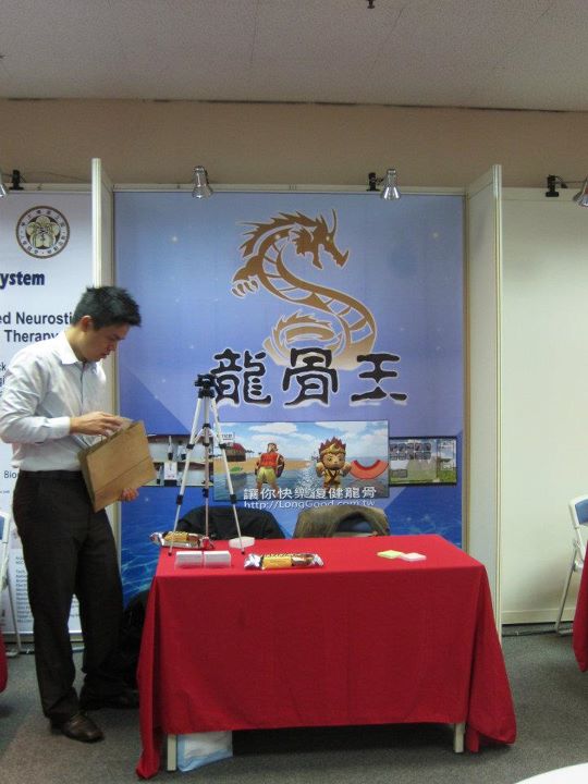 這是我們的展攤,難掩興奮之情,所以一早就到了。背景的海報設計得很讚吧!主題明確的傳達龍骨王的概念。這是由我們的美術總監馨如熬夜設計的。