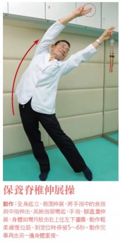 這動作是國泰醫院的簡文仁老師發明的,這個伸展操是用來保養脊椎。