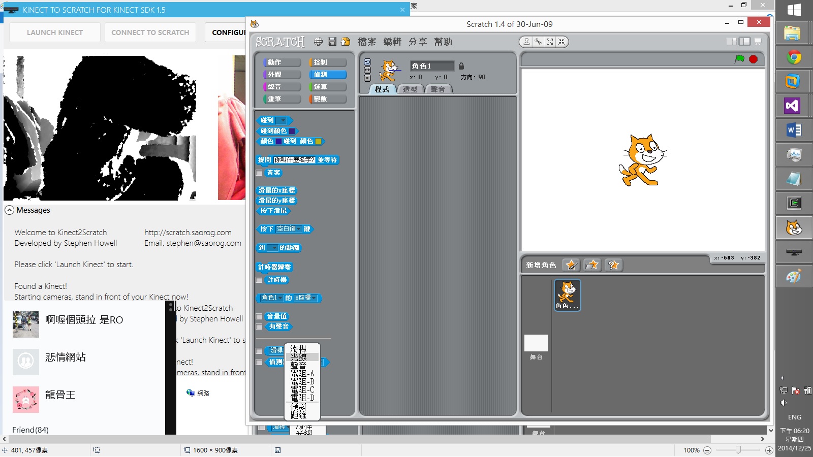 事情不是大家想的那樣,我們這次的體感工作坊,是用Scratch去做,雖然我們有人有Scratch的經驗,可是一切都是最新版Scratch 2.0,最新的應該最好用,可惜的是Scratch 2.0 只是BETA版,似乎還有些功能沒完全從1.4版移植到2.0版,在Scratch版本之間已經跌了一次,馬上退回1.4版