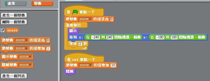 下午從打地鼠遊戲開始,傳統的打地鼠遊戲,會有地鼠從洞裡跑出來,然後讓我們有時間去打他,把他打回洞裡去。這裡呢?我們先用貓咪去當地鼠,讓他"一直"隨機從舞台顯示,然後停留一下,讓我們去打他。"打"的動作,就用滑鼠點一下代替吧!同時,被打到的時候我想要分數(Score)加10分,然後玩到一百分為止。