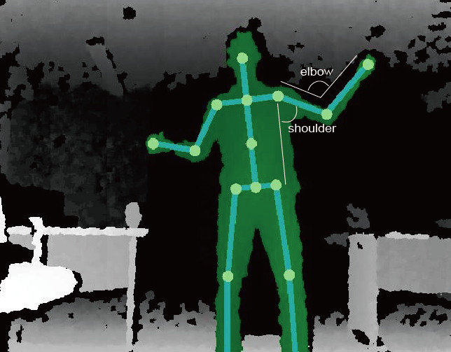 今天呢,要來跟大家說明紅色標注的地方:數據分析! 到底我們可以收到什麼樣的資訊呢? 先給大家看看這個示意圖, 偵測器可以透過「非接觸式的偵測」,去抓到人體的關節坐標位置,而我們就是用這些資料,去做運算,得到臨床人員所需的數據。 例如知道首、手肘、肩膀三個點的坐標後,可以算出手肘彎曲的角度