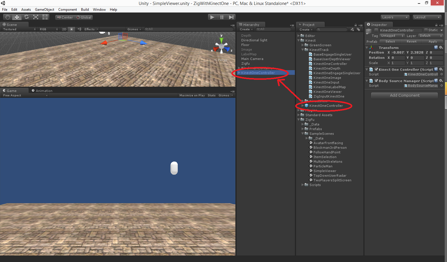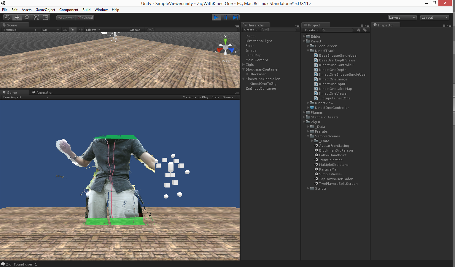 - 將KinectOneController Object 設定到ZigFu的GameObject