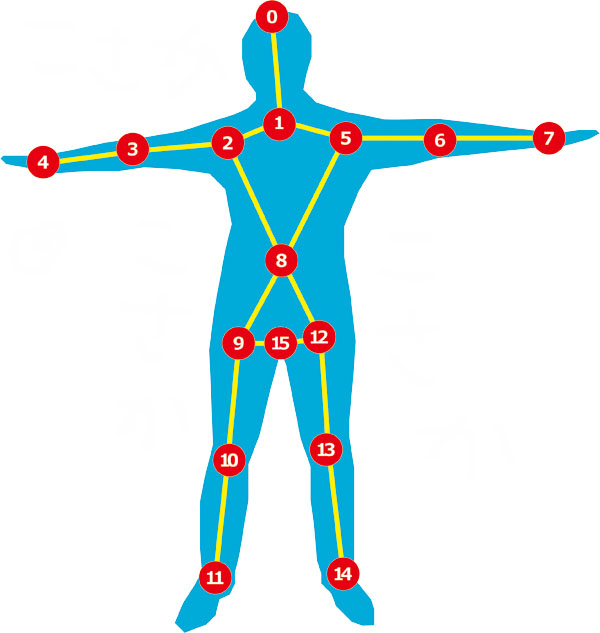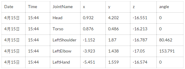 異なる関節の部分のx,y,z座標と角度を記録されます