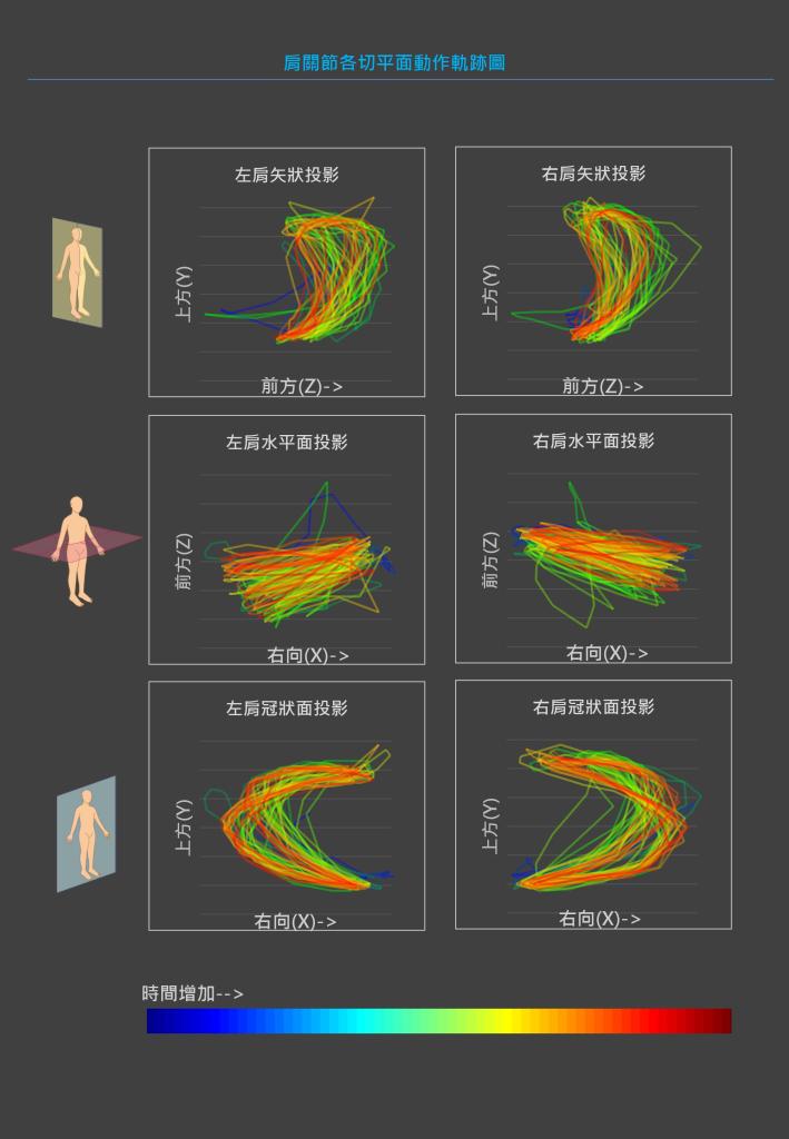 此圖表呈現出上臂遠端點相對於肩關節在各解剖平面上的活動路徑記錄圖。也就是以肩關節為原點,追蹤肘關節在所有動作過程中畫出的動態軌跡位置。此視覺化圖表能夠透露出動作控制的自由度、運動範圍大小、動作路徑的密集和精準度等質性評估取向。