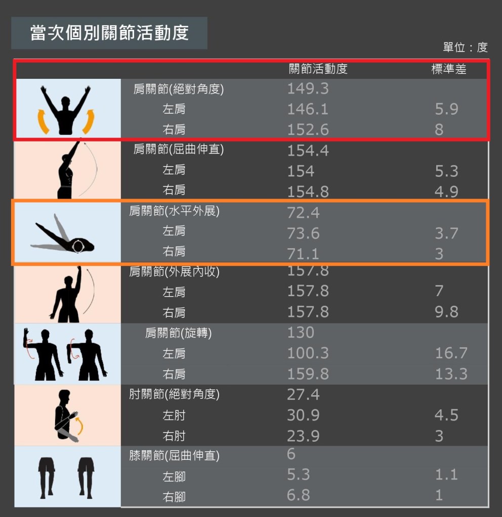 而橘色方塊內的表格數據代表的是手臂在靠內或外方向的角度位置,定義若在正前方抬手,則為0度,若在正側面外方抬手,則為90度。此個案的數據為平均73度,顯示患者傾向在scapular plane上活動。兩邊角度接近,符合人體常態做外展方向的肩肱動作模式。