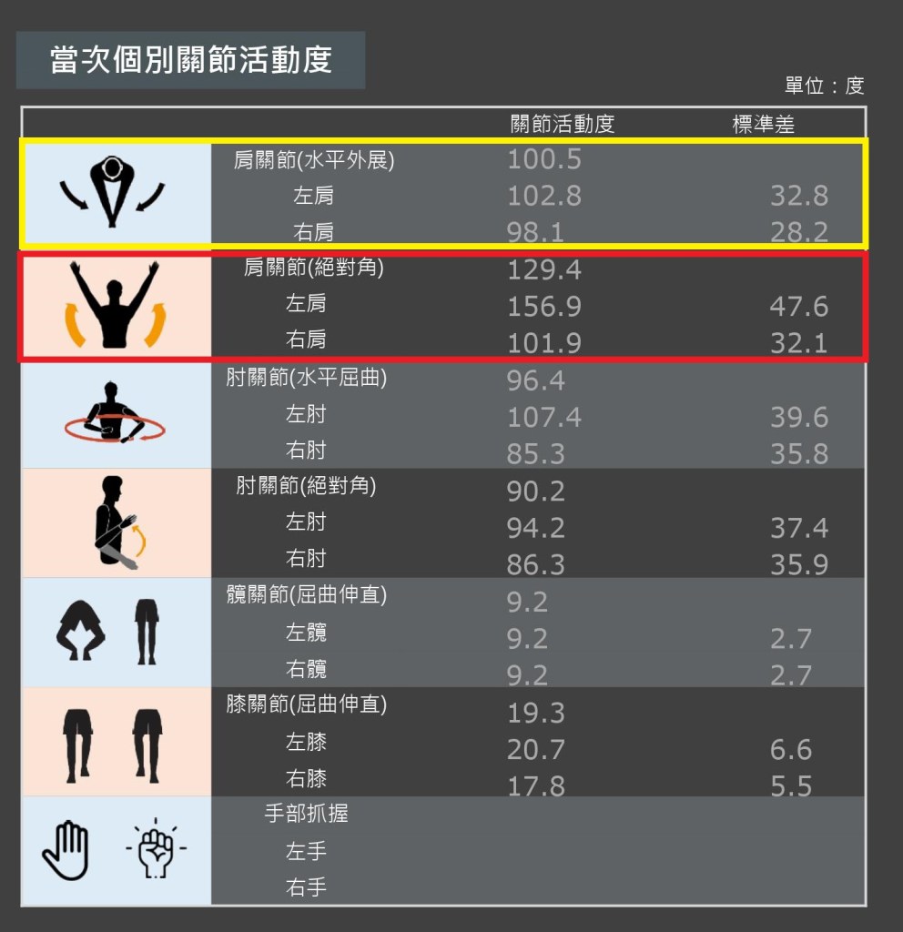 可以看到紅色方塊內,肩肱上下活動的絕對角度在右側的數據較左側小,顯示右側的平均活動自由度不足,自主關節運動範圍受到明顯限制,比較左右數據,兩者差距到55度之多。