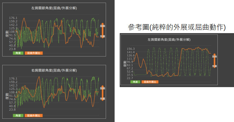 - 可對照參考圖,若此標準動作發生在典型的屈曲和外展方向,則曲線會維持在底部(外展方向)或僅在高峰處呈現(屈曲方向),而無上下劇烈跳動的狀況。