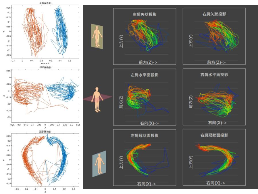 - 從此視覺化的作圖一目瞭然,在三個動作解剖平面上,左右側的上臂動作位移路徑活動範圍約略一致,顯示個案左右手的差異並不大。