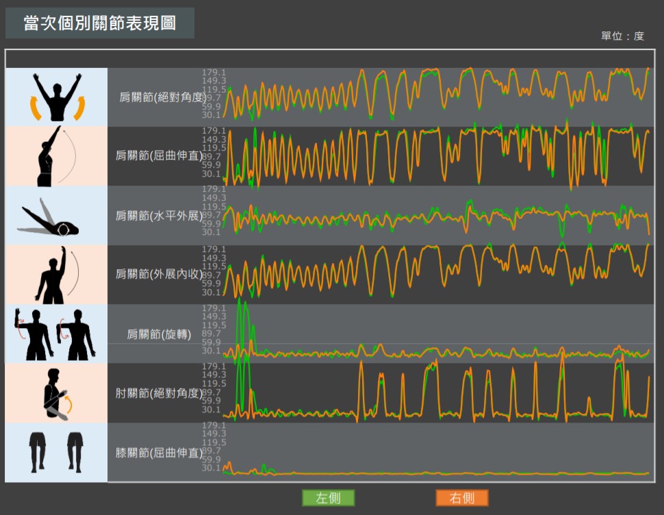 - 觀察綠色線(動作角度),左右兩手的動作幅度約略一致。兩側動作表現接近,並無明顯落差。但動作波型破碎、不規則,節律性較為凌亂,顯示動作控制的穩定性和流暢度仍不足。(可對照標準正常的參考圖,波型漂亮、起伏規律,每次達到的活動度最大值一致)